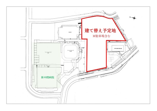 当院は昭和63年6月に「新中間病院」として現在地に開院して今年で35年目を迎えます。この度、病院建物の老朽化に伴い、隣地に新病院を建て替える計画を進めることとなりました。新棟建築計画が順調に進んだ場合、2024年7月より先行工事が始まり、約2年かけて建設し、順調に工事が進んだ場合、2026年4月にグランドオープンの予定です。